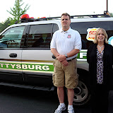 Steve Berry (“I’m Not An Ambulance Driver”), our public information officer, said a few words last night at dinner that have really stuck with me. One thing that he said was that “good men will always die but their names never will.” He also spoke of our solidarity on the ride. We all know that our profession and public safety, in general, can be fragmented. Within even one city, fire, police, and EMS will be separate departments like what we have in Austin, Texas. And then we are separated by the city limits and county lines and state lines. But, here on the ride, we are one. It doesn’t matter whether it says “EMS” or “fire” on the front of the building. These local squads have gone above and beyond their own call of duty to make us feel welcome. From speaking with the members of these local squads, they are honored to have us visit their station and their town, city, and even state. But, it makes us feel good to come to these stations and hear THEIR stories. To hear THEIR stories of why this ride and the memorial is significant to them, to hear about THEIR loss(es). Like I said earlier in the week, these are not just names. Barry Nagle’s wife was at the ceremony last night and we had the opportunity to thank her for sharing his life with us for the evening. Every rider has a set of “dog tags.” Each set of dog tags has a name of an inductee. Each rider is then connected to someone and is reminded day in and day out of why they are here and remember that while climbing hill after hill after hill. Barry’s wife was able to receive his dog tag last night from the rider carrying his tags. Thank you for your dedicated service, RIP Barry Nagle. A huge thanks to Megan Hollinger, Program Coordinator, Emergency Health Services Federation, Inc. and Allen Baldwin, Fire Chief Gettysburg Fire Department (25 years of service!!).